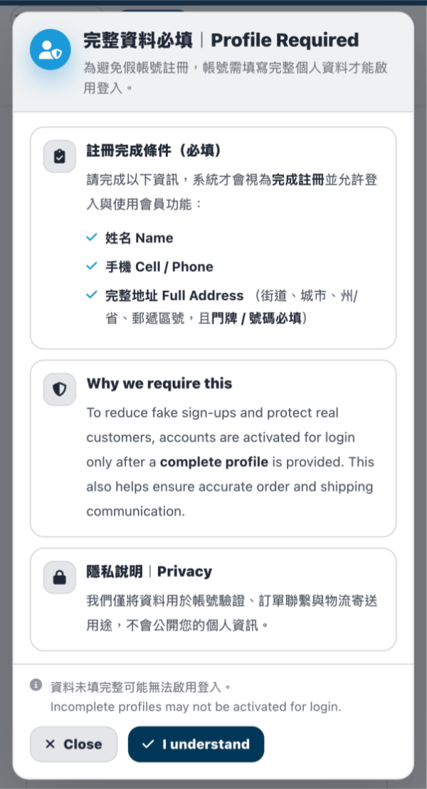 為提升會員系統安全性、降低假帳號註冊風險,並確保訂單聯繫與物流寄送資訊正確, Mansway 會員帳號將採用「完整資料」作為啟用登入與會員功能之必要條件。
